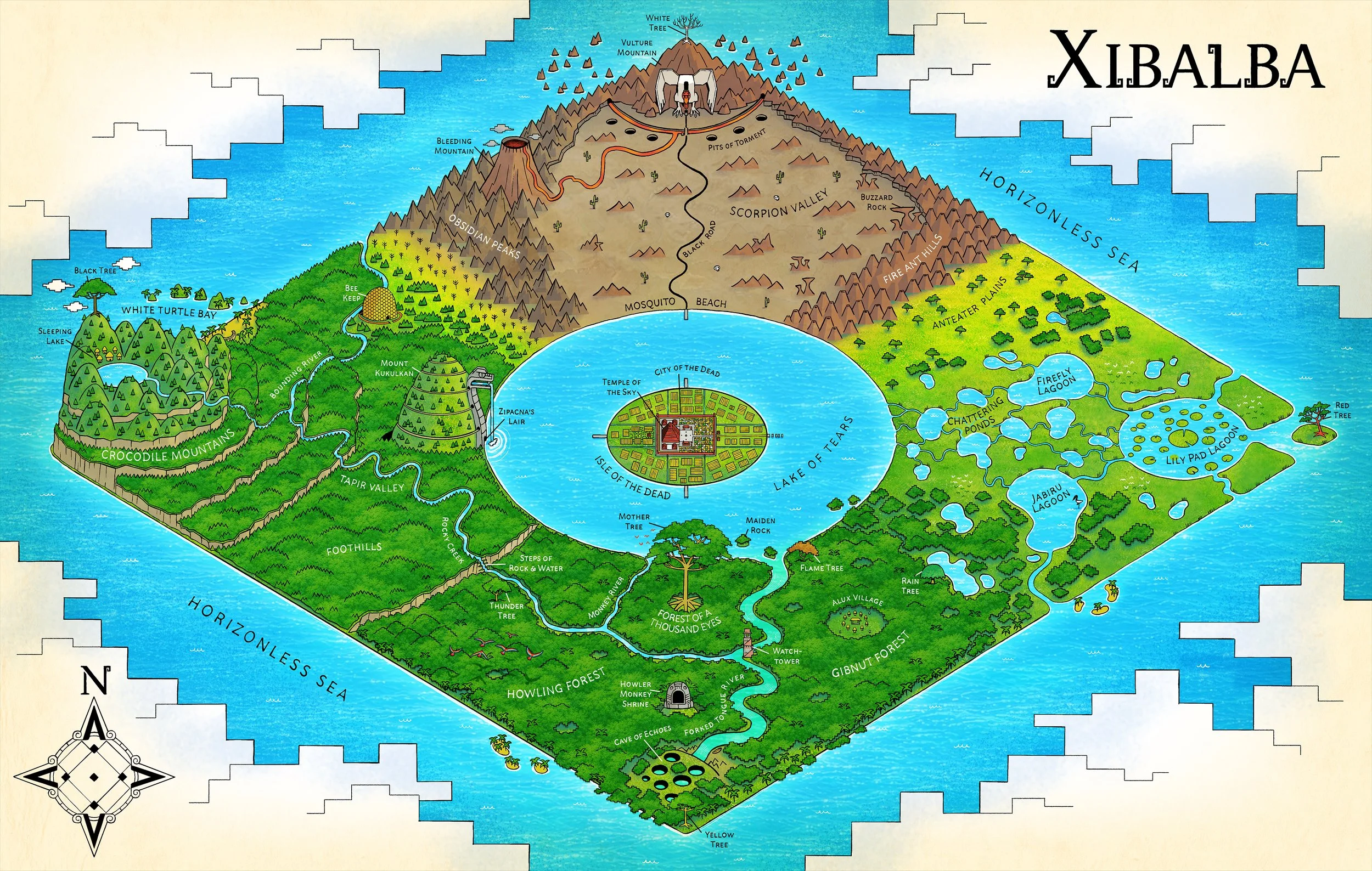 I finally got around to colouring that other map I drew of Xibalba, with north oriented at the top like most maps.